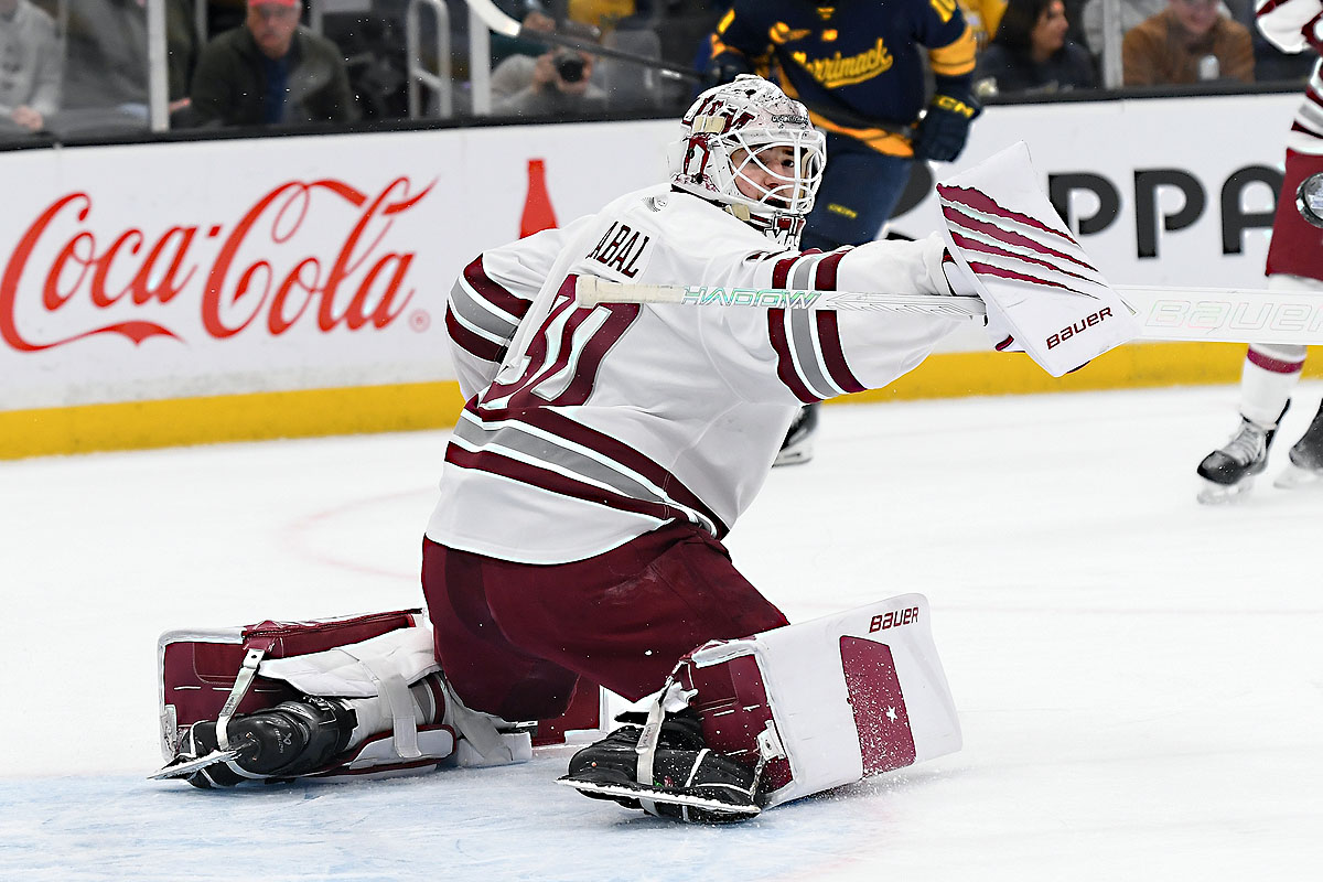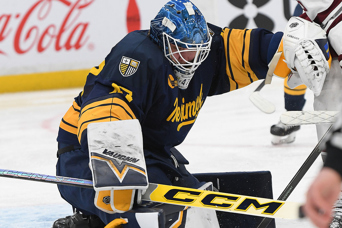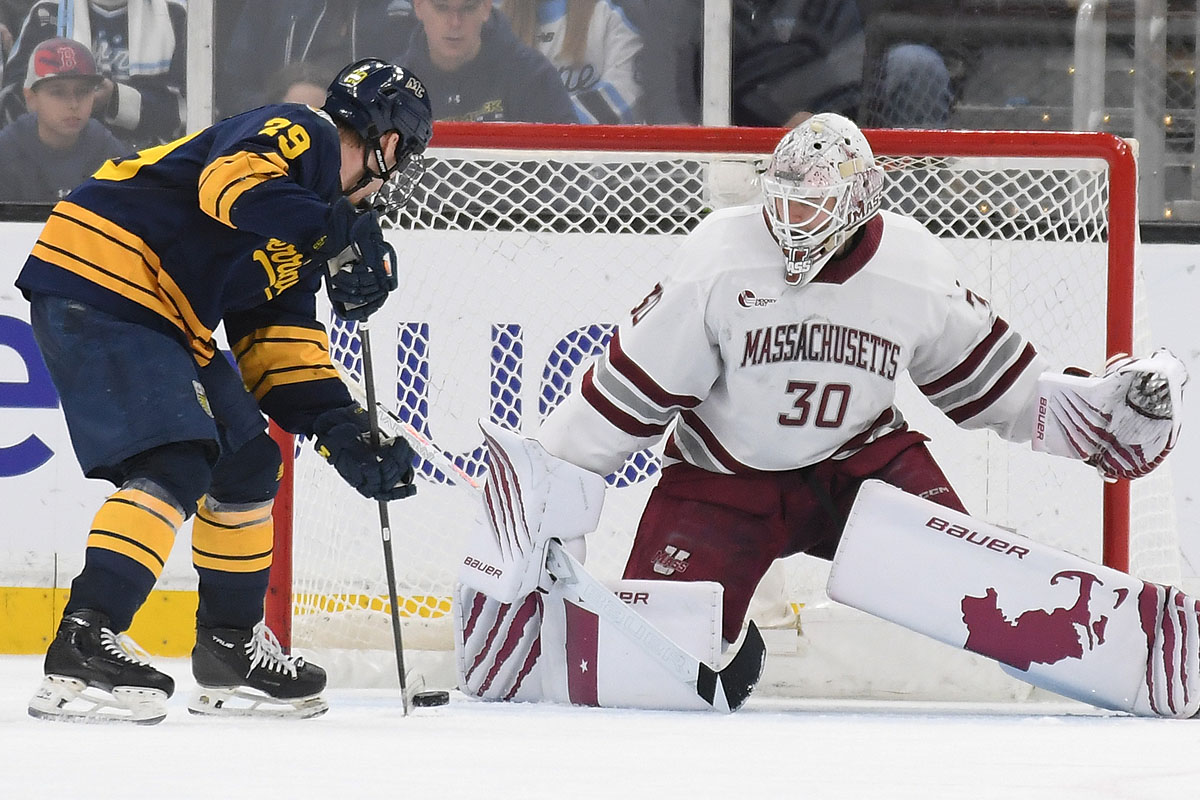 Lundgren stopped all 24 shots en route to his first shutout of the season, and the first in a Hockey East semifinal since Olympic hero Connor Hellebuyck of UMass Lowell blanked Notre Dame, 4-0, in the 2014 semis. Lundgren made 20 or his saves in the final two period, 10 in each. Merrimack’s defense also blocked 19 UMass attempts.